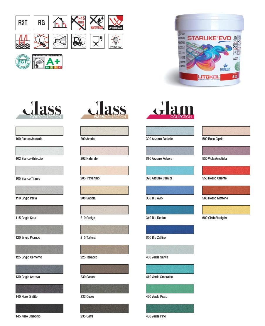 Argamassa de rejuntamento 2 componentes decorativa e resistente aos UVs. Aplicação e limpeza simples CLASS COLD COLLECTION STARLIKE EVO Argamassa epoxídica antiácida, de dois componentes para a betumação de pastilha de vidro, azulejos e mosaicos com juntas de 2 a 10 mm de largura. Betume epoxídico de fácil limpeza. Argamassa de dois componentes epoxídicos antiácidos. Uma parte é constituída por uma mistura de resina epóxi, agregados siliciosos e aditivos. Parte B consiste numa mistura de catalisadores biológicos. As principais características do produto são: • Fácil de limpar, em comparação com os betumes normais vedantes para juntas. • Estável e cor uniforme em todos os tipos de azulejos. • Alta resistência mecânica. • Baixa absorção da água. • Total ausência de fissuras ou falhas após endurecimento. • Excelente resistência química. Para betumação antiácida no chão e nas paredes interiores e exteriores azulejos e mosaicos com juntas entre 2 e 10 mm, por exemplo: • Pisos e revestimentos em geral. • Pisos e paredes da casa de banho e base de duche.. • Pisos aquecidos. • Terraços e varandas. Adequado para áreas expostas ao contrato com produtos químicos agressivos (ver quadro resistência química) tipo: laticínios, matadouros, fábricas, indústrias alimentares em geral. Também recomendado para betumação de piscinas e tanques com água doce ou água salgada.