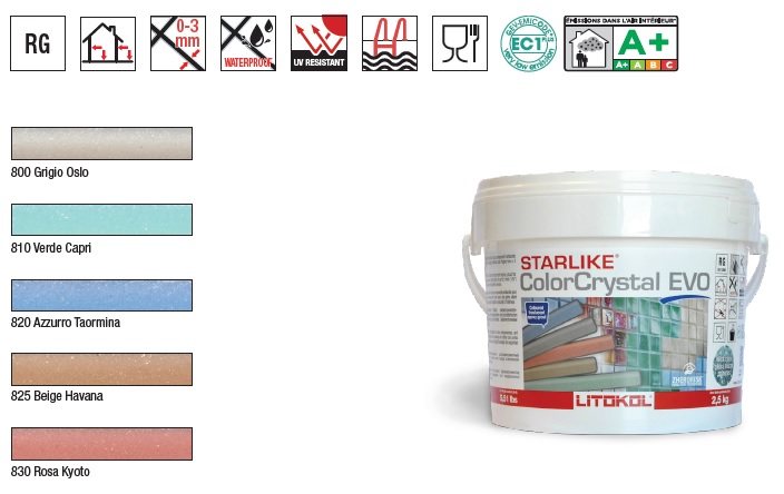 Argamassa de rejuntamento 2 componentes decorativa e resistente aos UVs. Aplicação e limpeza simples CRYSTAL COLLECTION